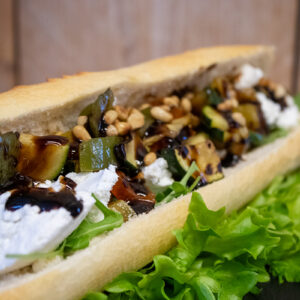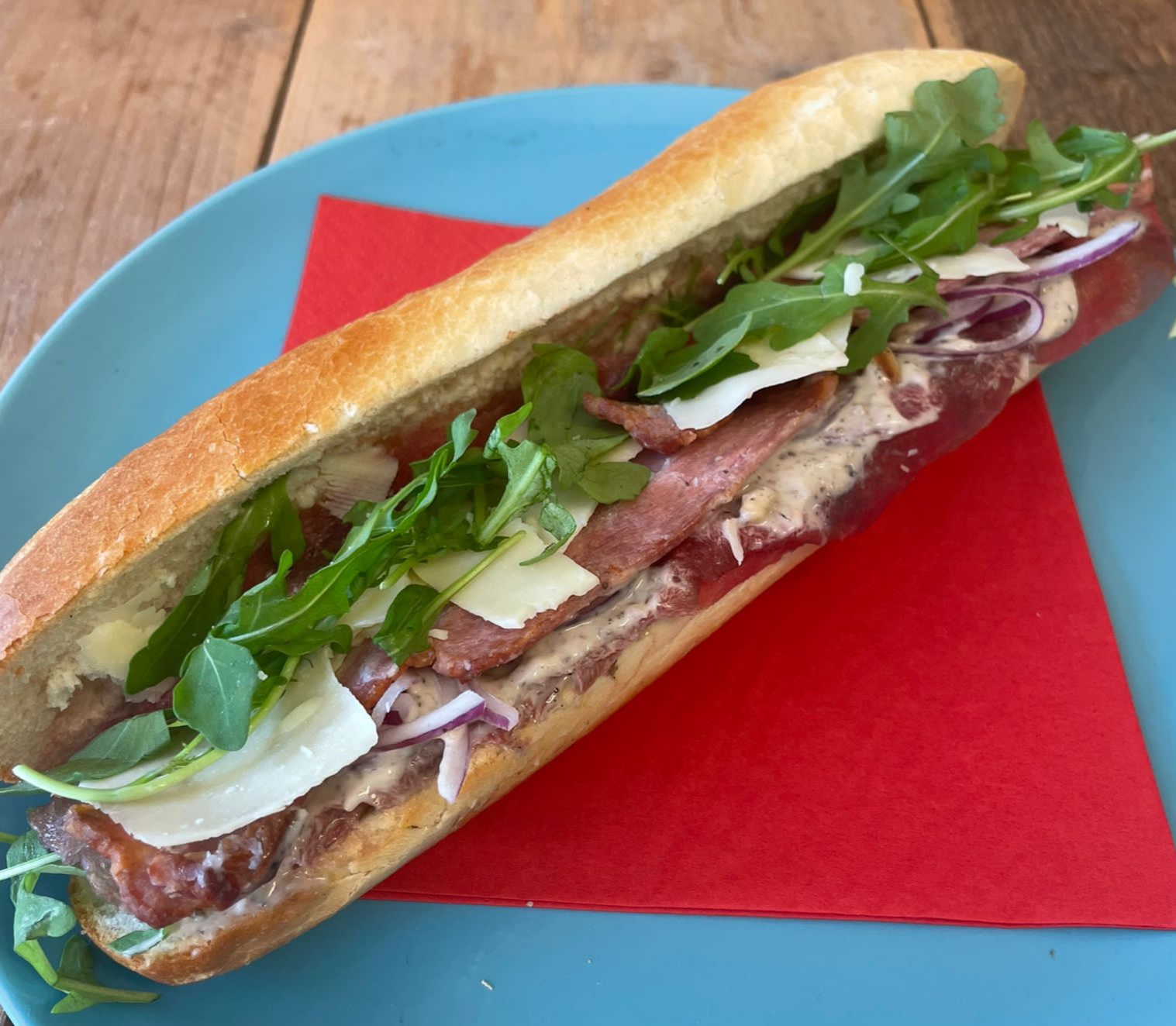 rucola, truffelmayonaise, carpaccio, pijnboompitjes, parmezaanse kaas, rode ui en gebakken spekjes