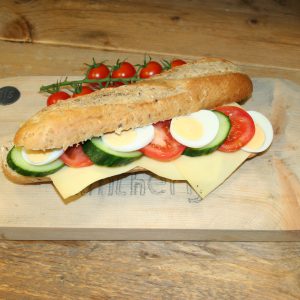 met rucola, mozzarella, tomaat, komkommer, walnoot en pesto-mayonaise