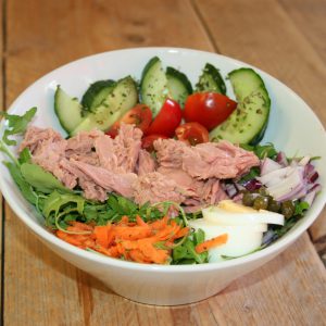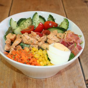 Maaltijdsalade met volkorenpasta en geitenkaas