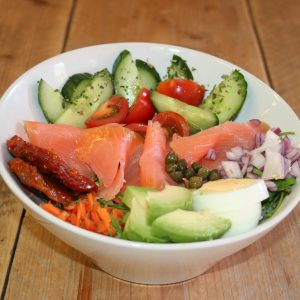 Maaltijdsalade met volkorenpasta en gerookte zalm